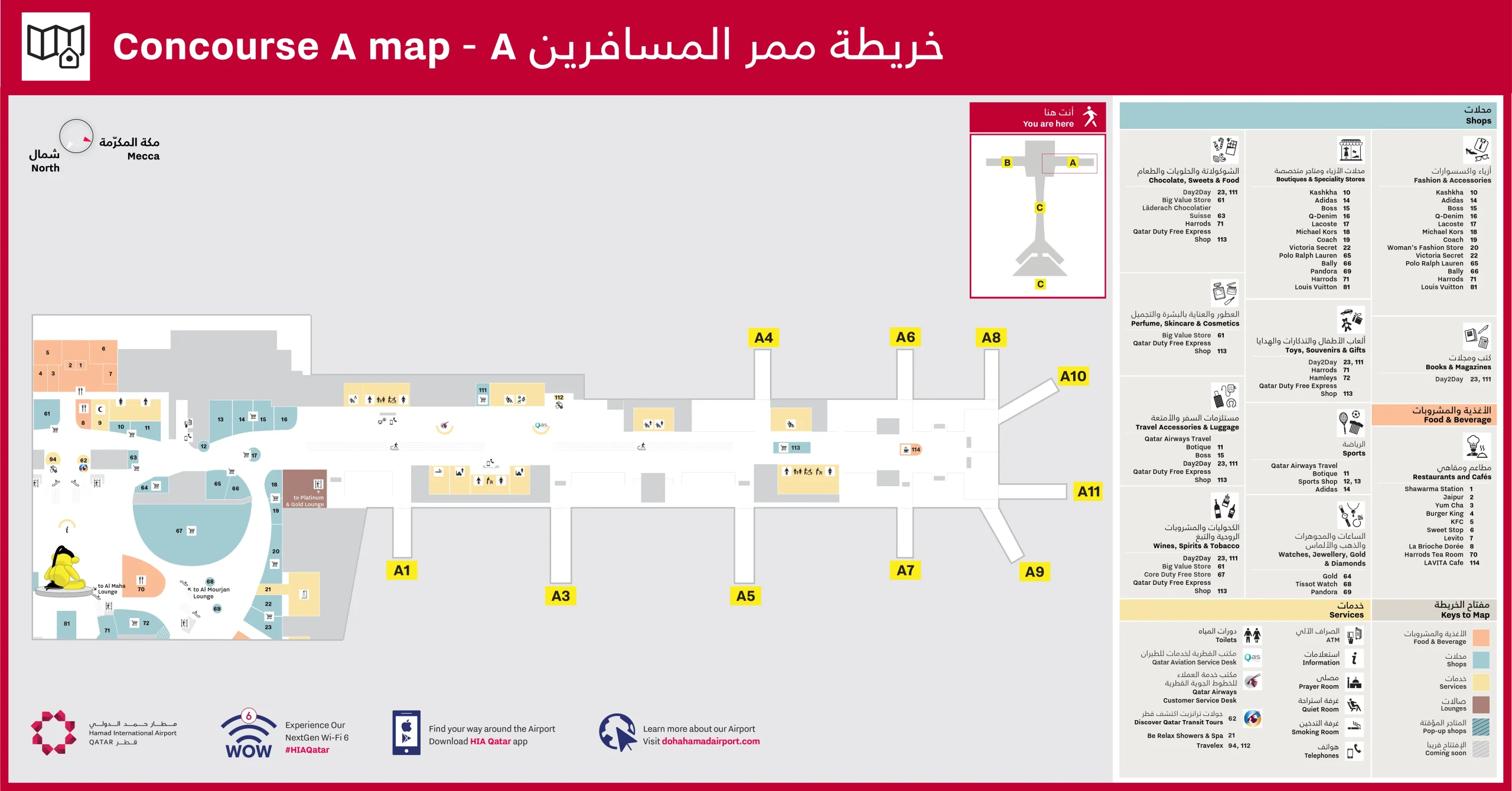 Restaurants and coffee shops: More than 30 coffee shops and restaurants at Hamad International Airport serve passengers by offering a variety of drinks, international dishes, authentic Qatari dishes, etc.